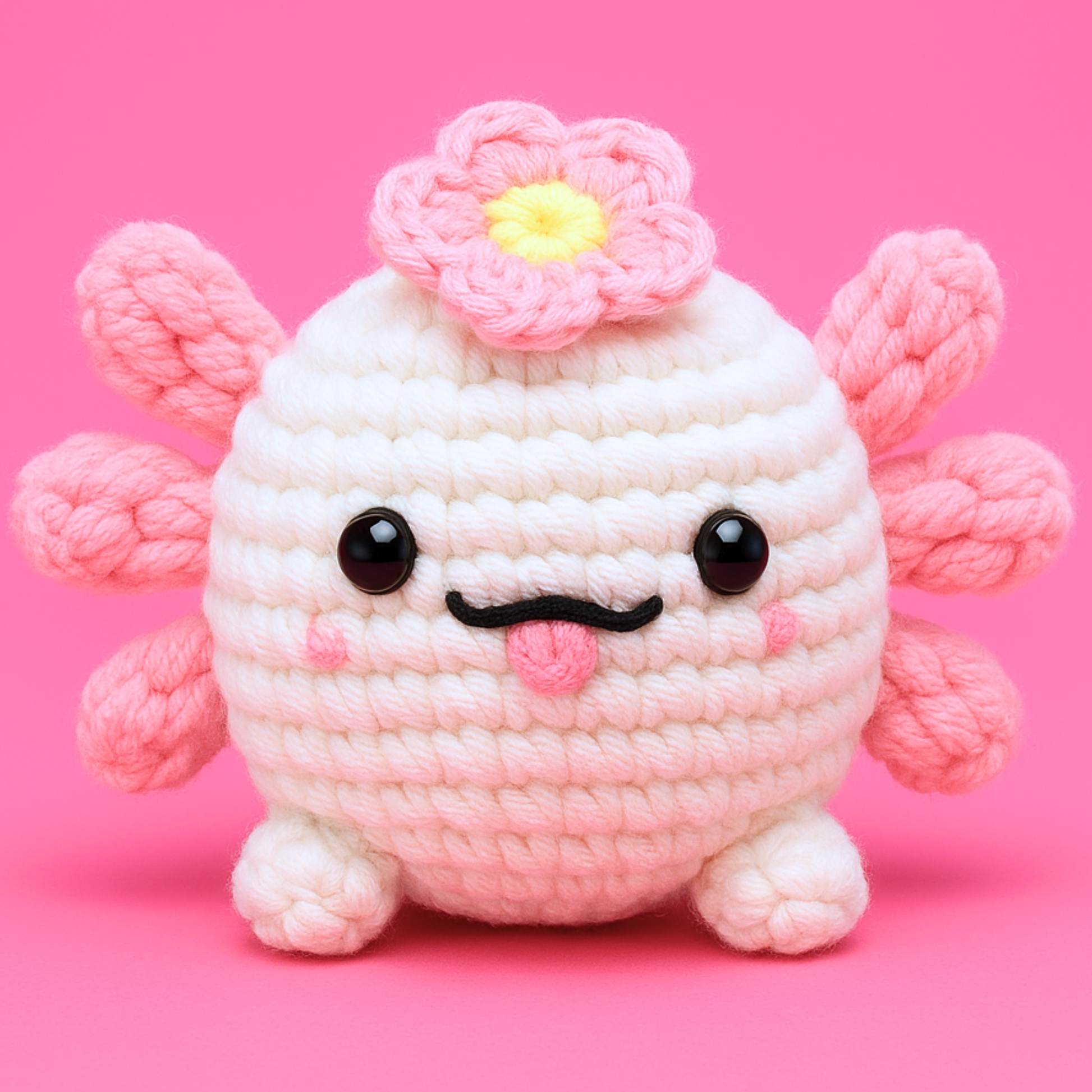 Crocheted in soft white yarn with sakura pink with little frilly gills and the happiest smile, Jelly brings a burst of fun to your Mini Collection.