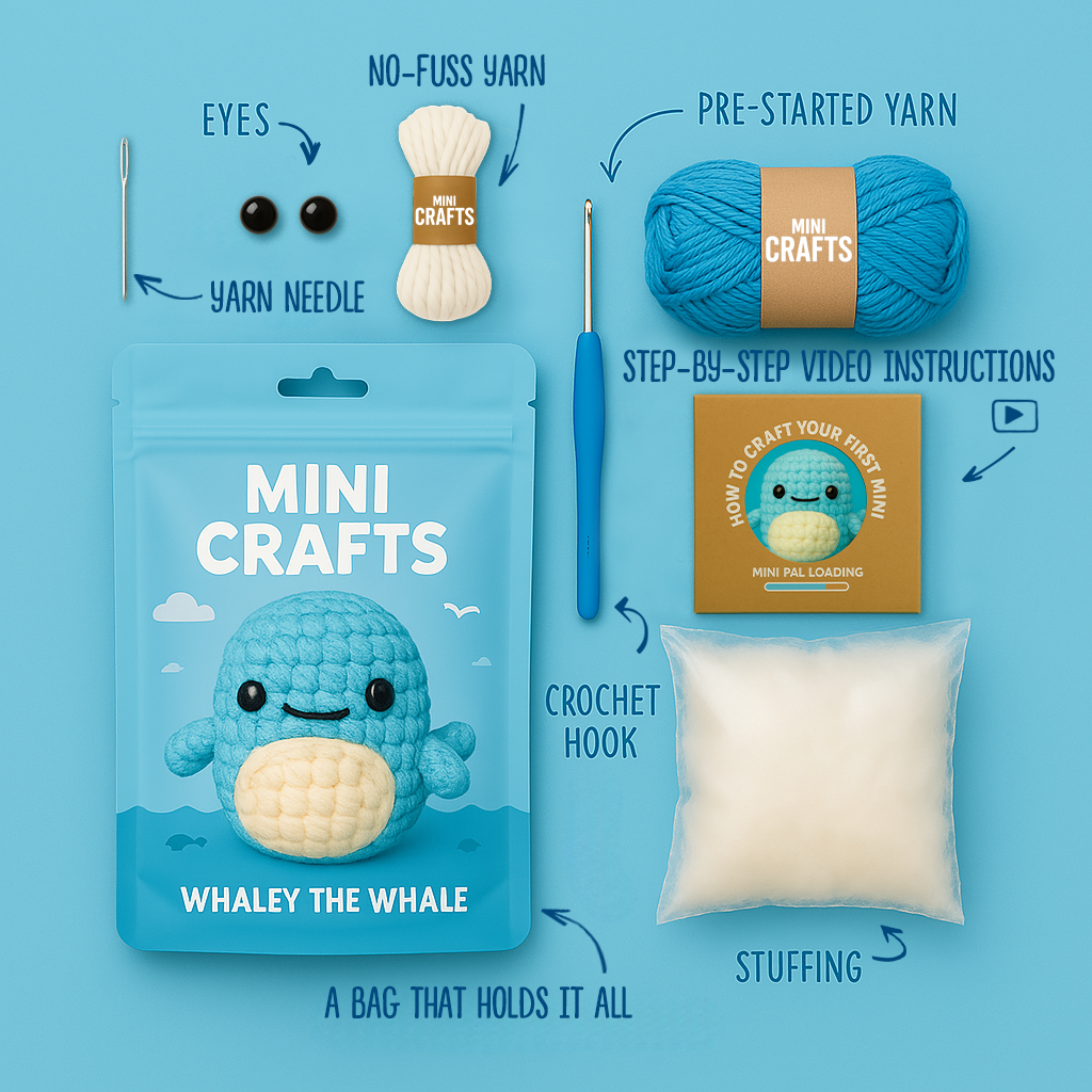 With this kit, you’ll ride the wave of beginner-friendly stitches while learning how to shape Whaley’s signature round belly and cute little fins. His pattern is perfect for building your crochet confidence—no swimming experience required. Just keep stitching, just keep stitching...